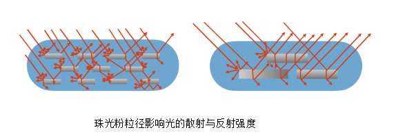 對於使用同一種基材的珠光粉,粒徑分布是調控其光學效果的關鍵參數。當珠光顏料粒徑較小時,光散射效應增強而反射減弱,呈現出較低的光澤度和較強的遮蓋力;反之,當顏料粒徑增大時,光散射效應減弱而反射增強,因而展示出高閃爍、高光澤、低遮蓋力的特點。